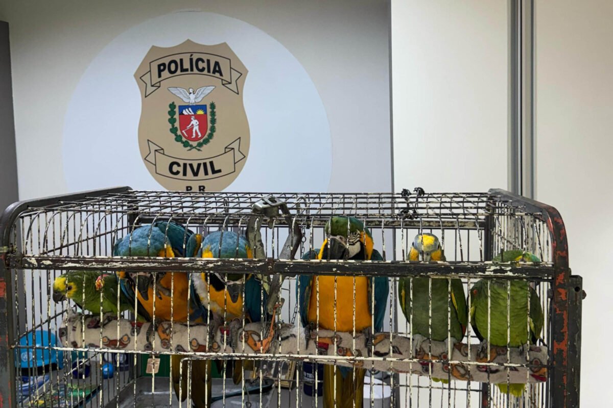 A Polícia Civil do Paraná (PCPR) resgatou nesta sexta-feira (21), no bairro Uberaba, em Curitiba, seis aves vítimas do tráfico de animais. As três araras-canindé e três papagaios estavam sendo mantidos em cativeiro. As investigações indicam que os animais eram comercializados ilegalmente pela internet, sem as devidas autorizações e sem os documentos exigidos pelos órgãos ambientais, configurando o crime de tráfico de animais.