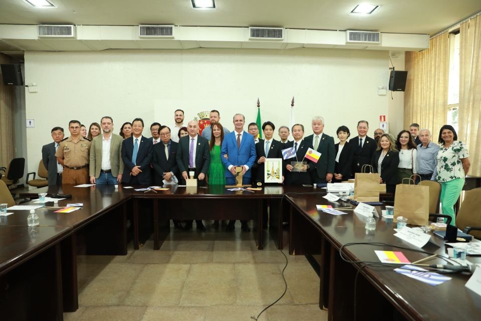 Na manhã deste sábado, 6, o prefeito Ulisses Maia recebeu a visita oficial da comitiva de Kakogawa para celebrar os 50 anos de irmandade entre Maringá e a cidade japonesa. A comitiva, formada pelo prefeito de Kakogawa, Yaushiro Okada, e outras sete autoridades locais, foi recebida no Paço Municipal com uma apresentação do coral dos alunos da Escola Municipal Diderot Alves da Rocha Loures. Na sequência, as autoridades se reuniram na Sala de Reuniões do Paço.