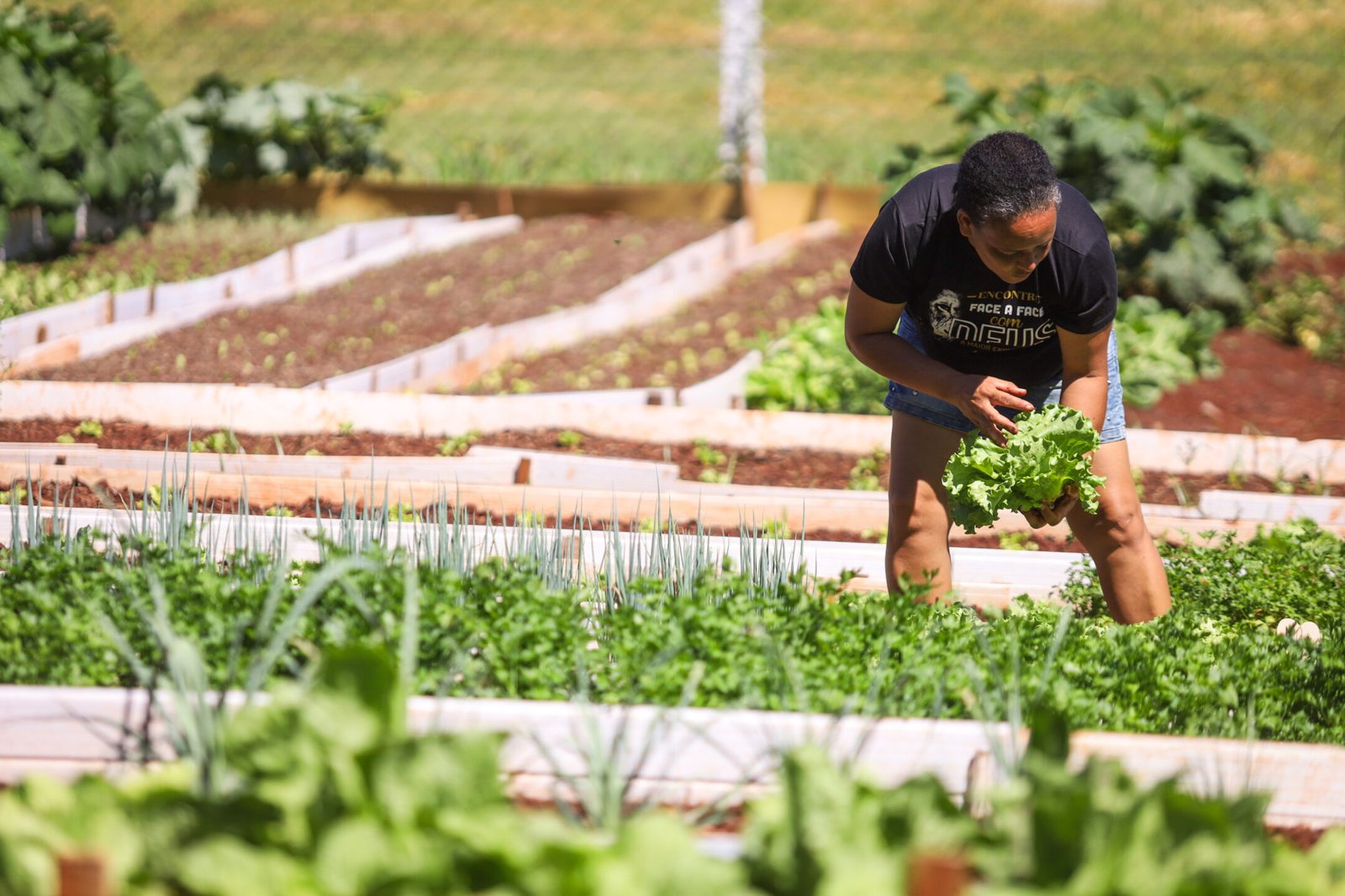 A horta conta com 46 canteiros de hortaliças e 12 espaços para leguminosas. Todo o cultivo é feito com fertilizante natural por meio de compostagem própria, garantindo alimentos sem agrotóxicos para a comunidade.