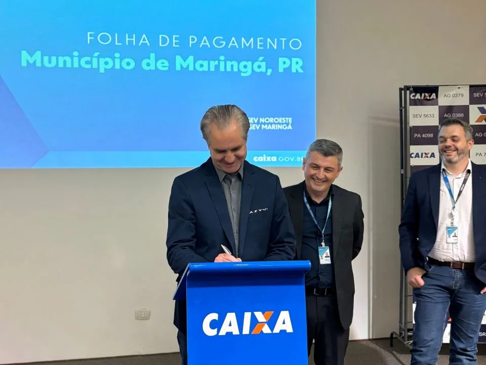 A Prefeitura de Maringá assinou na segunda-feira, 15, contrato com a Caixa Econômica Federal, instituição financeira que será responsável pela folha de pagamento do município. O contrato é válido por cinco anos e a previsão é que a Caixa inicie a operação a partir de junho. A Prefeitura recebeu R$ 32 milhões da instituição financeira. O valor será investido pelo município em limpeza urbana e segurança.