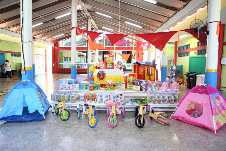 São distribuídos itens como bonecas de pano, incluindo bonecas negras, bicicleta de madeira, cama elástica, bingo de alfabeto, carrinho de supermercado infantil, barracas, teclado musical, corda de pular, cubo mágico, frutas de brinquedo e diversos outros brinquedos. A secretária de Educação, Nayara Caruzzo, destaca que os materiais fazem parte do projeto de inovação educacional implantado em toda a rede municipal.