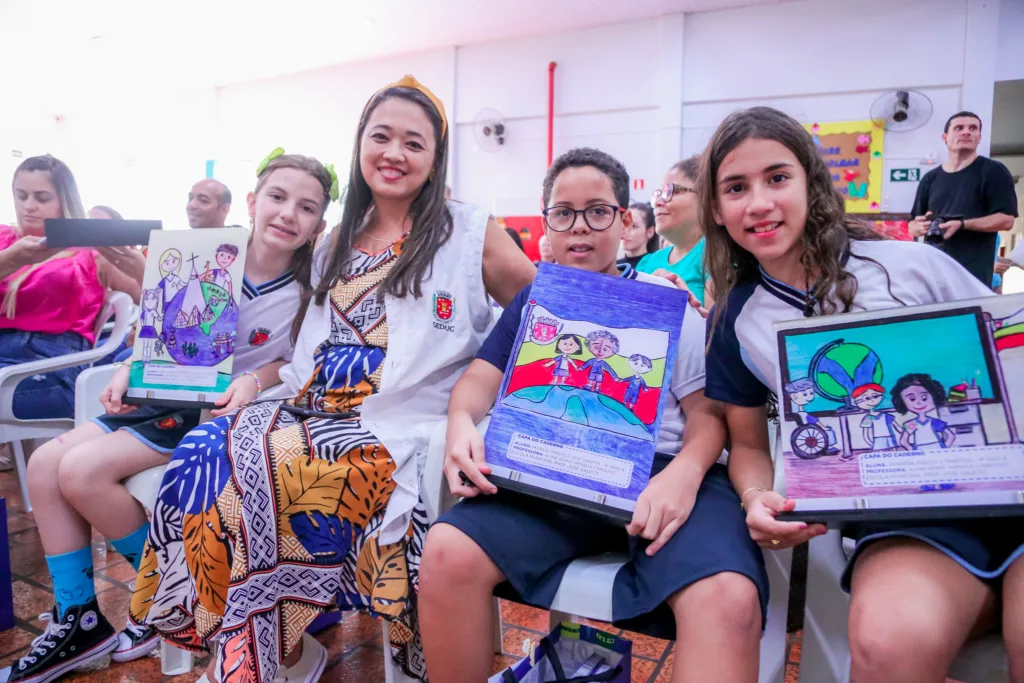 A gestão municipal reconhece o talento dos estudantes da rede municipal e valoriza a produção artística autoral. Desde 2021, as capas dos cadernos e agendas do kit escolar são ilustradas com desenhos criados pelos alunos e escolhidos por meio de concurso envolvendo todas as escolas municipais. Nesta quinta-feira, 28, a Prefeitura de Maringá, por meio da Secretaria de Educação, premiou os alunos vencedores do concurso de 2024.