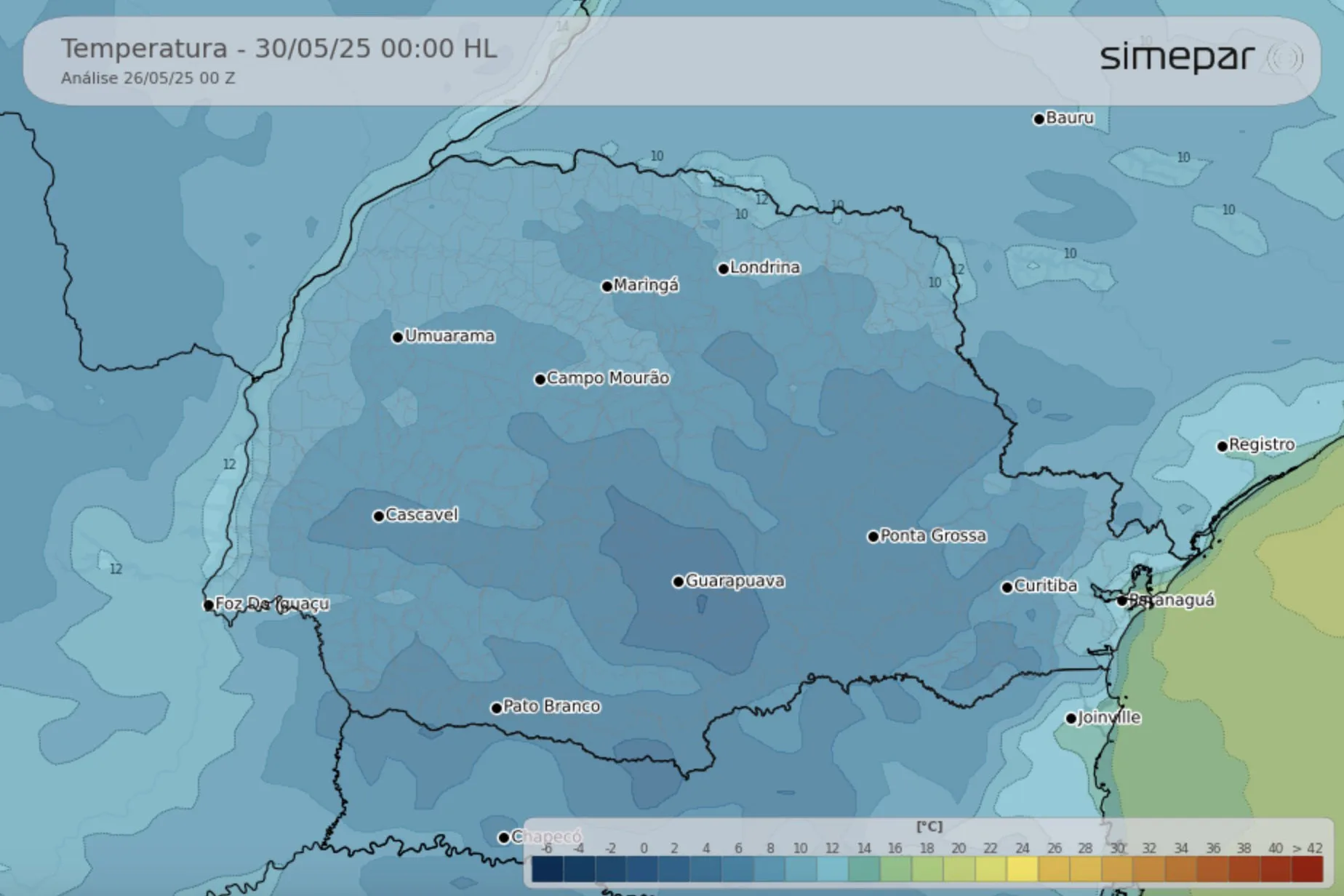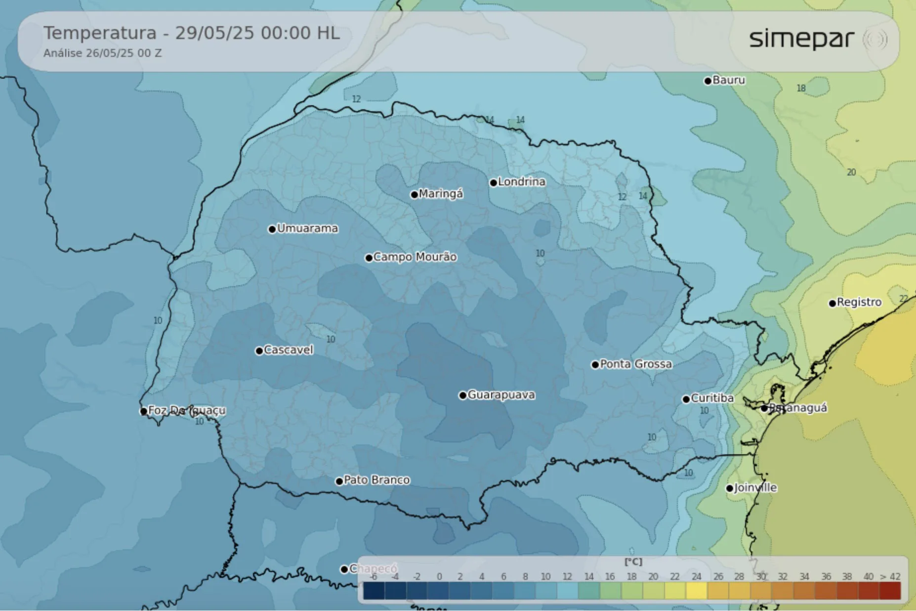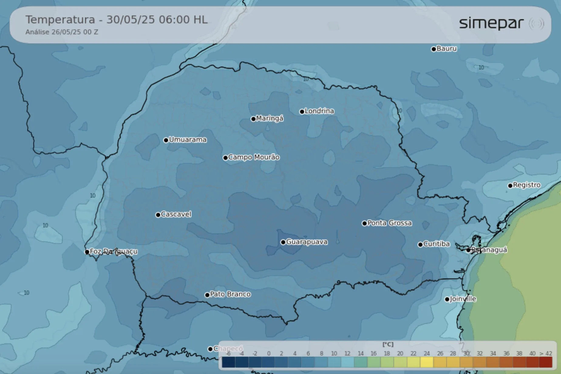 Como o sistema atmosférico tem alterações constantes, a previsão indicada no site pode sofrer alterações. Por este motivo, é recomendável acompanhar a Palavra do Meteorologista, que está na página inicial do site do Simepar, e os boletins emitidos diariamente pela equipe de meteorologistas e divulgados nas redes sociais e no canal de WhatsApp do Simepar. Os meteorologistas contextualizam os dados e explicam as alterações atmosféricas em todas as regiões do Paraná.