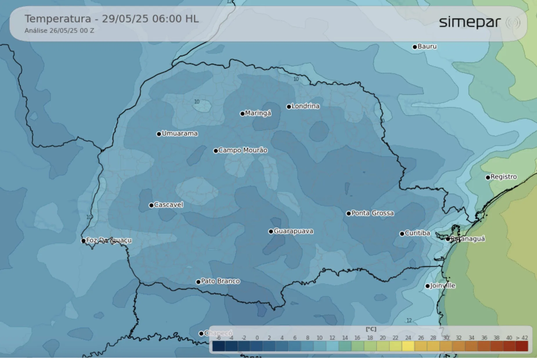 Após a chuva, chega o frio. Assim que a frente fria passar, avançará sobre o Paraná uma massa de ar de origem polar que vai trazer uma queda expressiva nas temperaturas e uma mudança no padrão na quarta-feira, em específico: ao invés do dia começar gelado e as temperaturas subirem, como tem sido costumeiro no Outono, as temperaturas máximas ocorrerão durante a manhã, e ao longo do dia sofrem um forte declínio, ficando abaixo dos 10°C no Sudoeste e Centro-sul do Paraná.