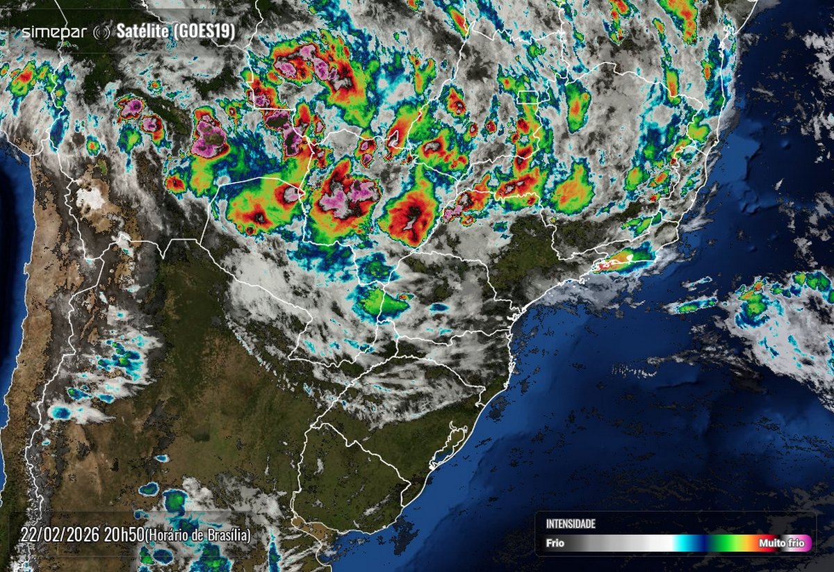 Nesta segunda-feira, o panorama pouco se altera. A presença de um sistema de baixa pressão localizado entre o Paraguai e a Argentina continua enviando umidade e energia para a atmosfera sobre o Paraná. Esse cenário mantém o ambiente favorável ao desenvolvimento de áreas de instabilidade.