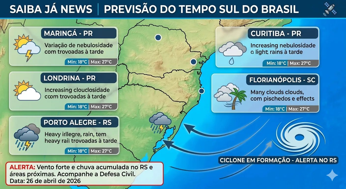 O domingo, 26 de abril de 2026, marca uma transição nas condições meteorológicas em importantes capitais e cidades do Sul do país. A aproximação de um sistema de baixa pressão, associado à formação de um ciclone extratropical, traz um cenário de instabilidade que começa a se desenhar na região.