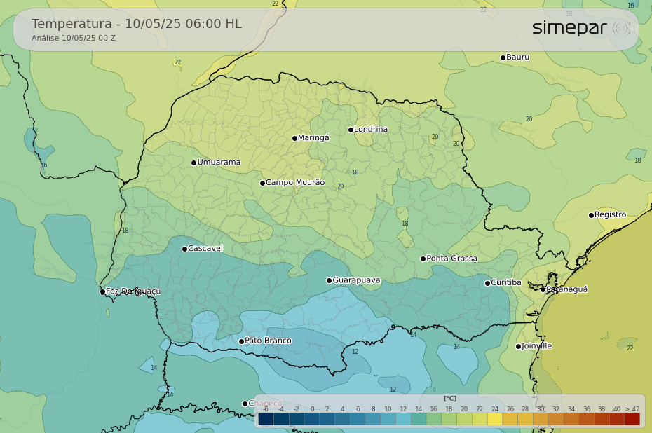 No domingo, o tempo se estabiliza em grande parte do Paraná, mas o frio ganha força na metade sul. Os termômetros podem registrar mínimas de até 6 °C no Centro-Sul e Sudeste, exigindo agasalhos reforçados. A umidade oceânica aumenta a nebulosidade na RMC e litoral, com chance de chuviscos durante o dia.