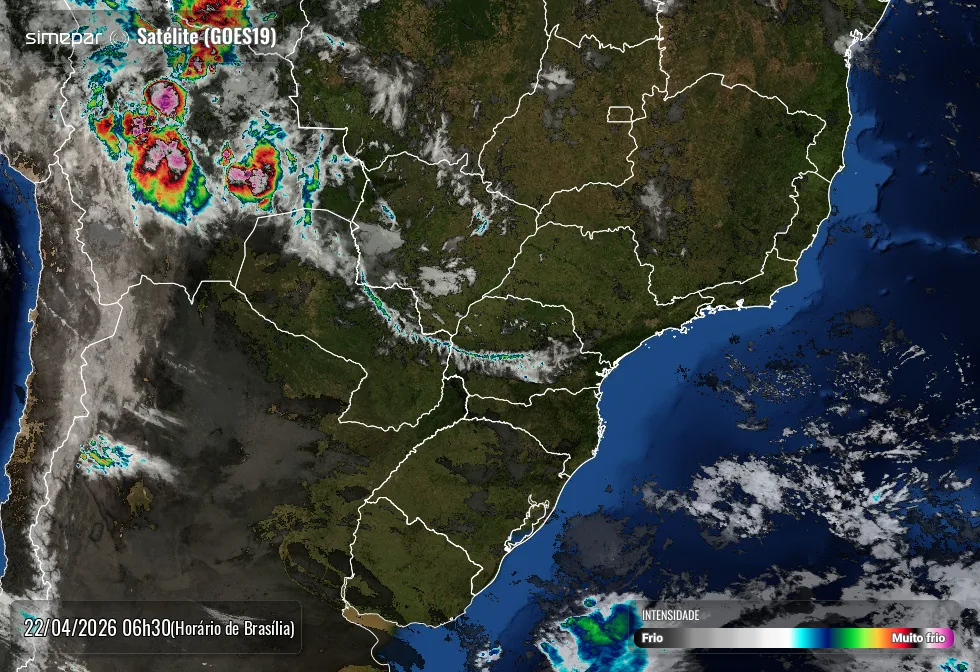 De acordo com o Sistema de Tecnologia e Monitoramento Ambiental do Paraná (Simepar), o predomínio ao longo da tarde será de sol. A previsão indica possibilidade de pancadas de chuva isoladas na faixa sul do estado, especialmente próximo à divisa com Santa Catarina e à tríplice fronteira.