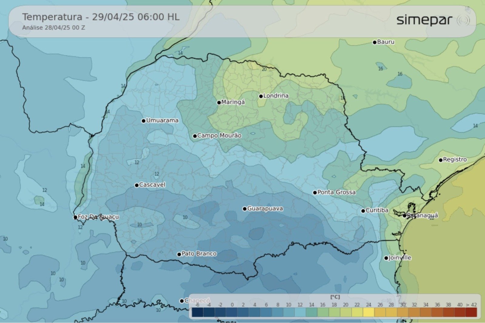 “Entre terça e quinta-feira, há a possibilidade de geada fraca ao amanhecer, especialmente na terça, favorecida pelo predomínio de céu claro durante a madrugada. A partir de quarta-feira, a circulação atmosférica vinda do oceano para o Interior do Estado deverá aumentar a cobertura de nuvens, abrangendo desde o Litoral até os Campos Gerais e a região Sudeste. Com isso, a chance de geada será reduzida progressivamente ao logo da semana, mas não totalmente descartada, especialmente em municípios mais ao sul e no interior do Estado.”