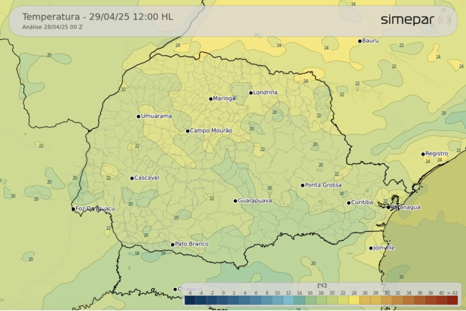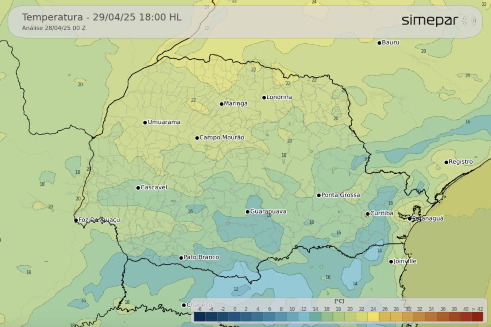 As máximas na terça-feira à tarde deverão variar entre 20ºC e 23ºC na maior parte do Paraná, chegando a 25ºC e 26ºC nas faixas Norte e Oeste. As temperaturas máximas ao longo da semana deverão se elevar gradativamente, atingindo cerca dos 28ºC em cidades como Paranavaí, Loanda, Foz do Iguaçu, Guaíra e Colorado na sexta-feira. A partir de sexta-feira, as temperaturas mínimas ao amanhecer deverão se elevar gradativamente, atingindo valores próximos aos 10ºC.