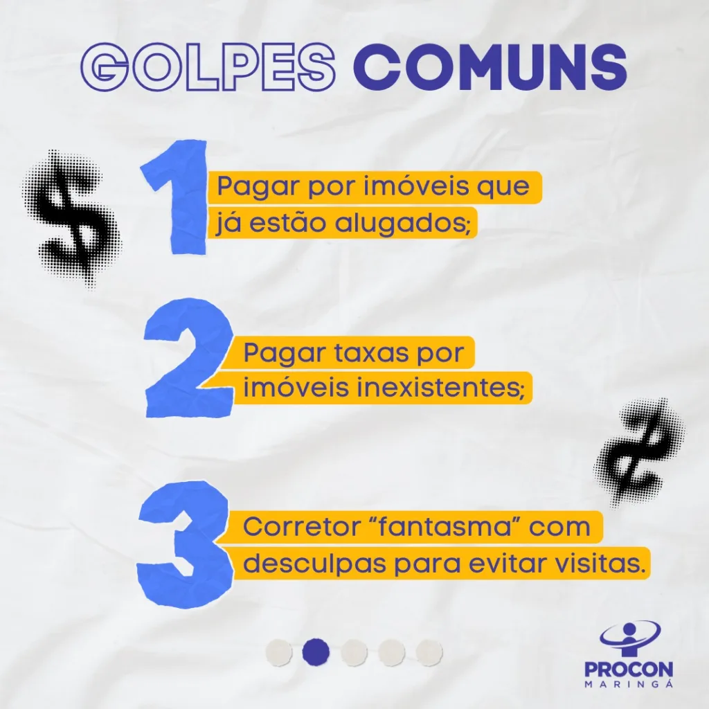 As vítimas acabam pagando pelo aluguel de um imóvel e são surpreendidos com o espaço sendo alugado para outra pessoa, tendo que pagar taxas antecipadas por um imóvel que não está disponível ou, até mesmo, alugar imóveis que não existem. Também é comum o golpista clonar anúncios reais e enganar o interessado em alugar um imóvel. Principalmente em anúncios pela internet.