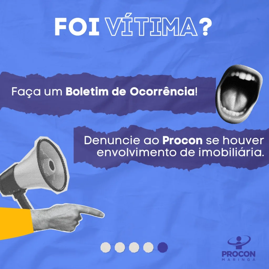 Caso caia em um golpe imobiliário, faça um Boletim de Ocorrência numa delegacia de Polícia Civil. E, se tiver dados da imobiliária, também vale denunciar no Procon.