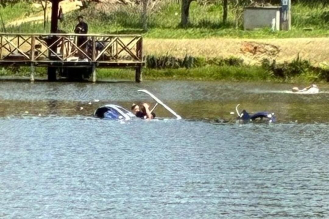 Aeronave caiu em pesqueiro no início da tarde deste domingo. Duas pessoas estavam a bordo e foram resgatadas antes da chegada dos bombeiros