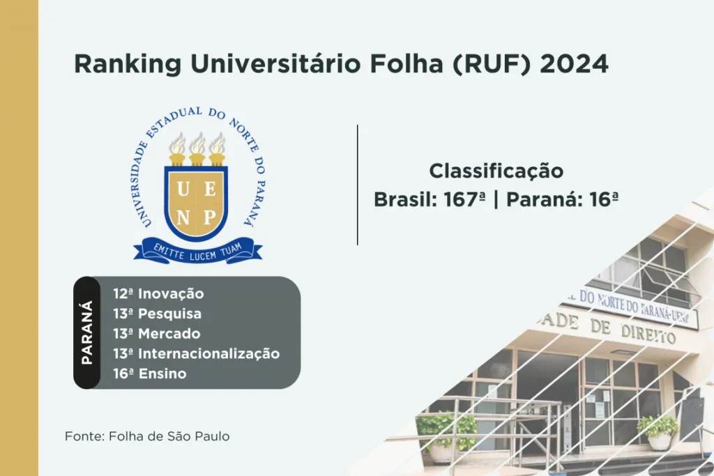 Entre as 16 universidades paranaenses, públicas e privadas, elencadas no RUF 2024, a UEM, a UEL e a UEPG estão na segunda, terceira e quarta posições, nessa ordem, entre as mais bem avaliadas nos indicadores que analisam as iniciativas de pesquisa científica. A UEL, a UEPG e a Unicentro aparecem em terceiro lugar nos quesitos relacionados à inserção de profissionais no mercado de trabalho, às oportunidades de internacionalização e às ações de inovação, respectivamente.