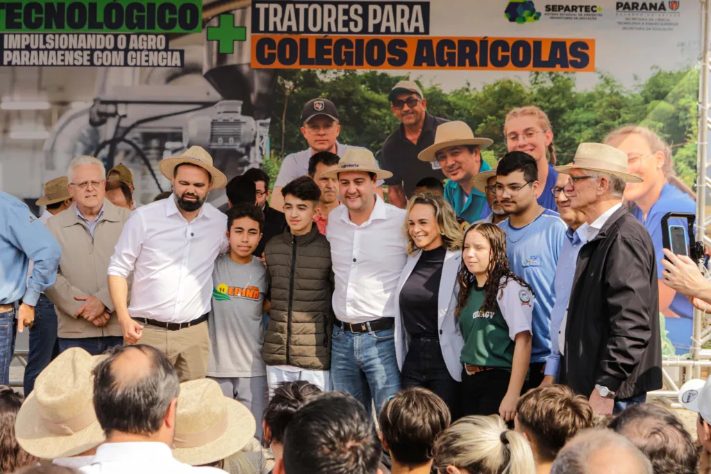 NOVOS TRATORES – Na solenidade, o governador Ratinho Junior também oficializou a entrega de 17 tratores para colégios agrícolas do Estado. O investimento nos equipamentos é de R$ 4,4 milhões. O objetivo é ajudar na formação dos alunos, permitindo que eles apliquem conhecimentos teóricos de forma mais dinâmica nas atividades agrícolas e pecuárias da fazenda-escola, além de terem contato com equipamentos de última geração.