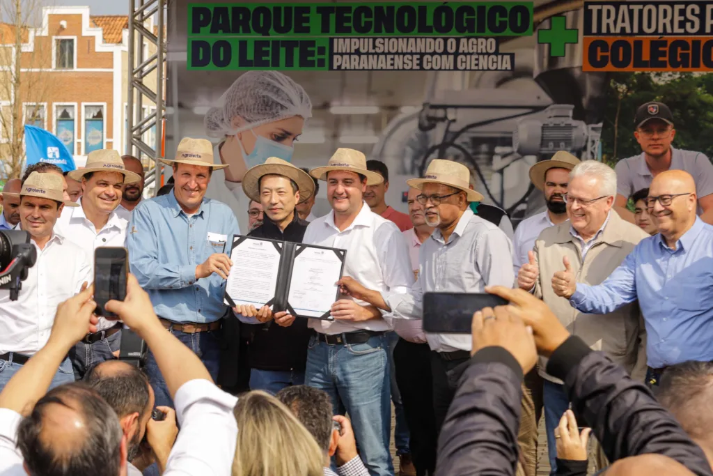 O governador Carlos Massa Ratinho Junior assinou nesta quinta-feira (8), em Castro, nos Campos Gerais, um memorando de entendimento com a cooperativa Castrolanda para a criação do Parque Tecnológico Agroleite. A ideia é que o espaço integre universidades, centros de pesquisa, empresas e startups para desenvolver soluções tecnológicas para a cadeia produtiva do leite.
