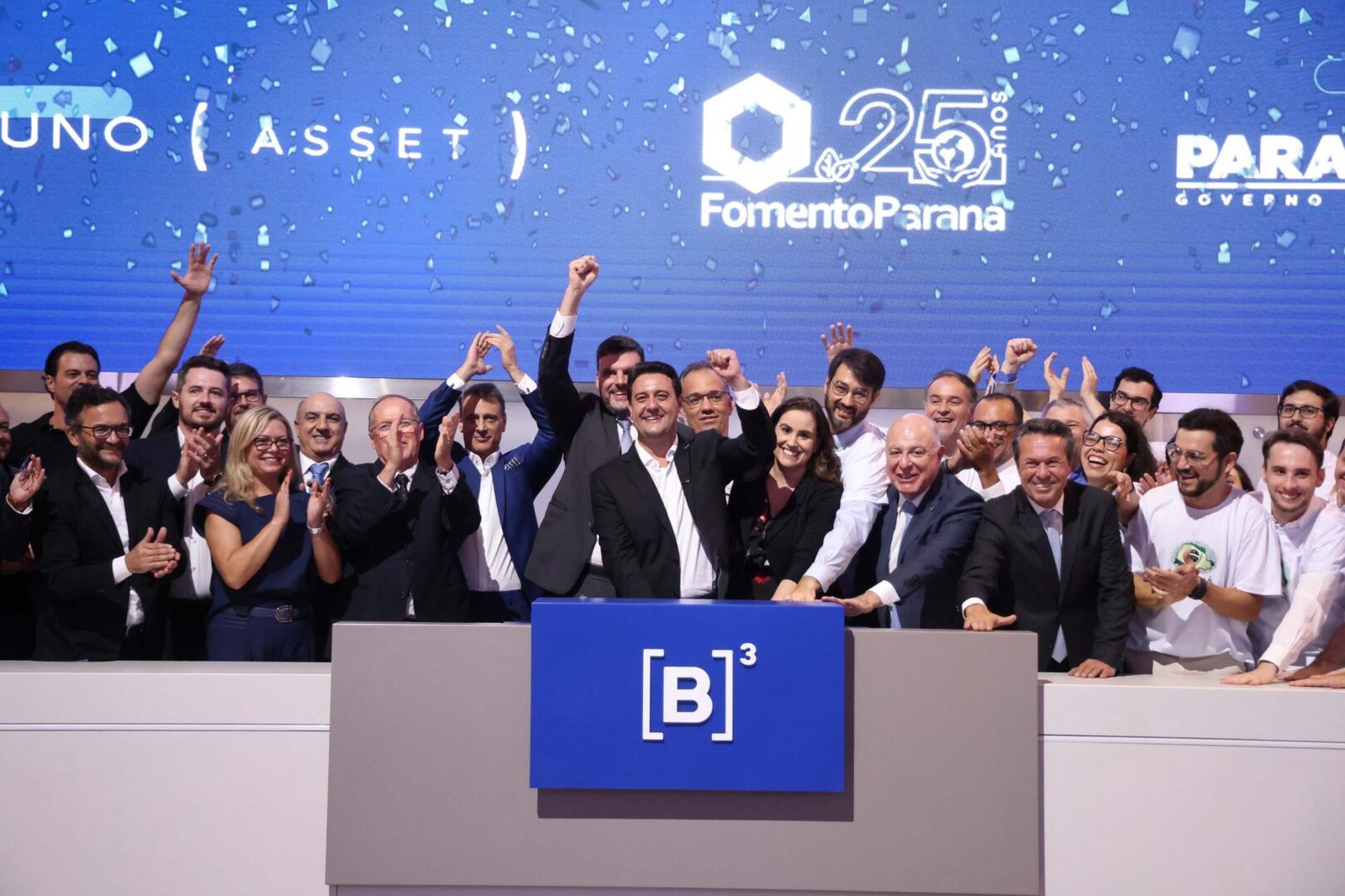 PRESENÇAS – Também participaram do anúncio na B3 o secretário estadual da Agricultura e do Abastecimento, Márcio Nunes; o secretário de Comunicação, Cleber Mata; o diretor Administrativo do BRDE e ex-presidente da Fomento Paraná, Heraldo Neves; o presidente do Sistema Ocepar, José Roberto Ricken; os deputados federais Pedro Lupion e Arnaldo Jardim; e o Chief Information Officer (CIO) da Suno Asset, Vitor Duarte. Pela Fomento Paraná, estiveram presentes as diretoras Administrativa e Financeira, Mayara Puchalski, e Jurídica, Louise Garnica; os diretores de Operações do Setor Público, Mounir Chaowiche; Operações do Setor Privado, Renato Maçaneiro; e de Mercado, Vinícius Rocha.