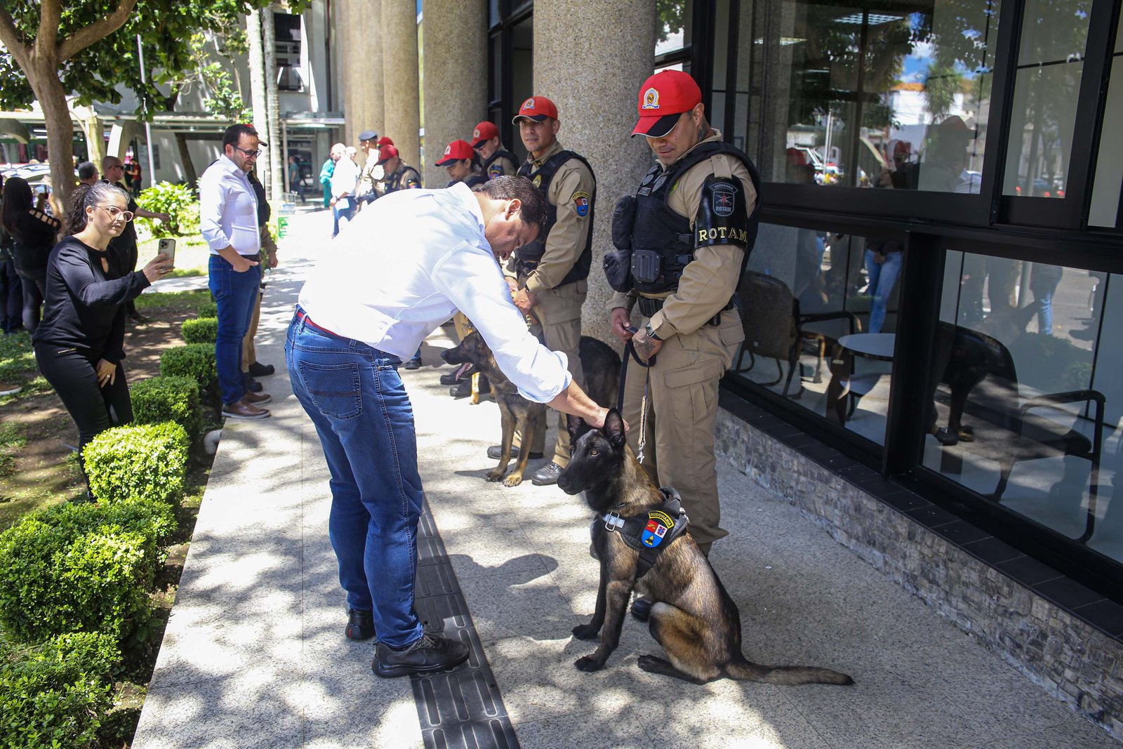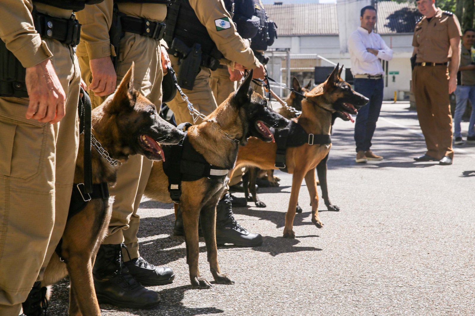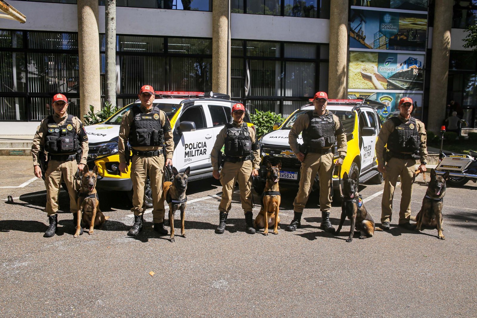 Junto com as novas viaturas, foram entregues cinco cães policiais treinados para farejar narcóticos e armamentos, que ajudarão o BPRv no combate ao tráfico nas rodovias paranaenses.