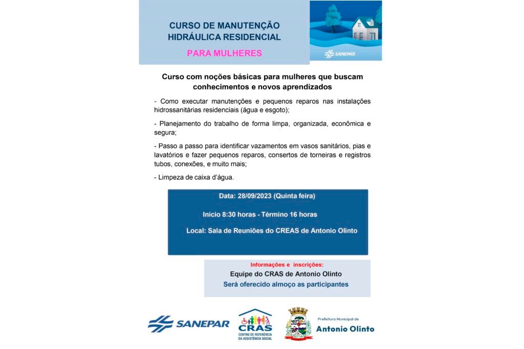 A Companhia de Saneamento do Paraná (Sanepar) e a Prefeitura de Antônio Olinto estão com inscrições abertas para o curso de Manutenção Hidráulica Residencial. Exclusiva para mulheres, a capacitação será na próxima quinta-feira (28), na sala de reuniões do Centro de Referência de Assistência Social de Antônio Olinto (CRAS).