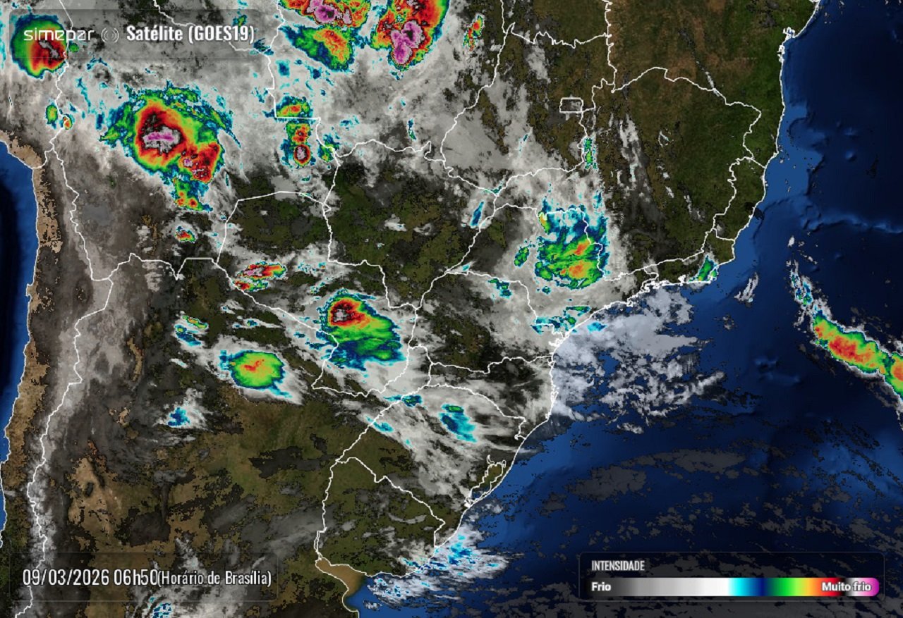 A previsão indica que, durante o período da tarde, as precipitações devem ganhar intensidade, vindo acompanhadas de descargas atmosféricas. Já no Leste, abrangendo a Região Metropolitana de Curitiba e o Litoral, a circulação de ventos transporta umidade do oceano, mantendo o céu encoberto com chuvas ocasionais e pouca variação térmica.