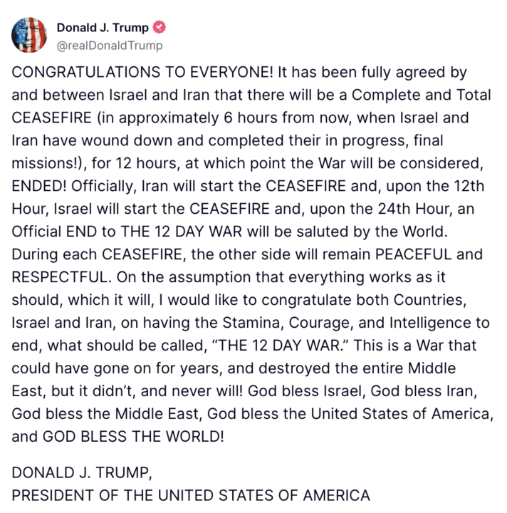 Poucas horas depois de o Irã disparar mísseis sem sucesso contra a base americana no Catar, o presidente Trump afirma, em uma publicação no Truth Social, que um cessar-fogo foi alcançado entre Israel e o Irã e que a guerra terminará.