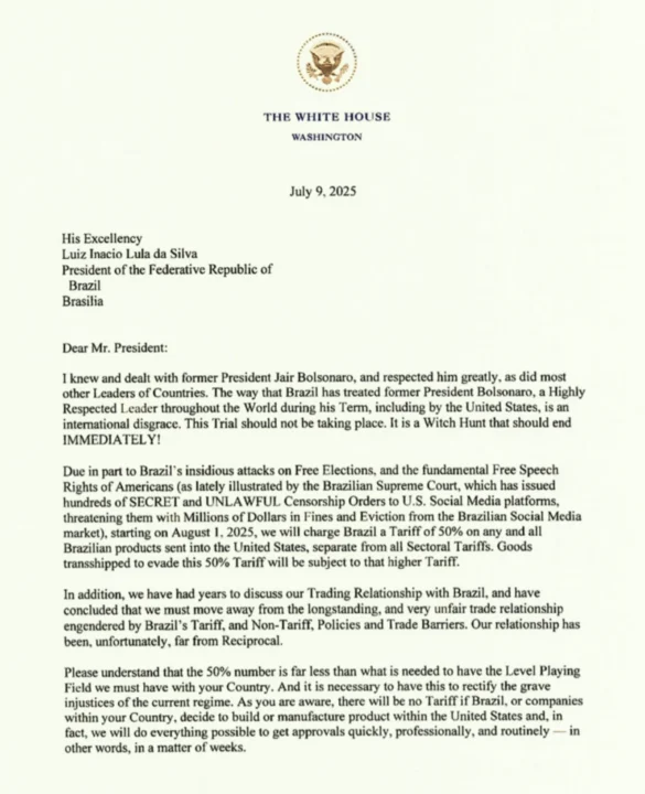 A correspondência também acusa o Brasil de supostos ataques contra as eleições livres e menciona decisões “secretas e ilegais” do STF que teriam violado a liberdade de expressão de cidadãos americanos. “Em parte pelos ataques insidiosos às eleições livres e ao fundamental direito à liberdade de expressão de norte-americanos (como ultimamente ilustrada pelo STF, que tem emitido centenas de ordens de censura SECRETAS e ILEGAIS contra plataformas de redes sociais norte-americanas, ameaçando-as com multas de milhões de dólares) […] nós vamos cobrar do Brasil tarifas de 50% sobre qualquer e todo produto brasileiro enviado aos Estados Unidos”, diz um trecho da carta.