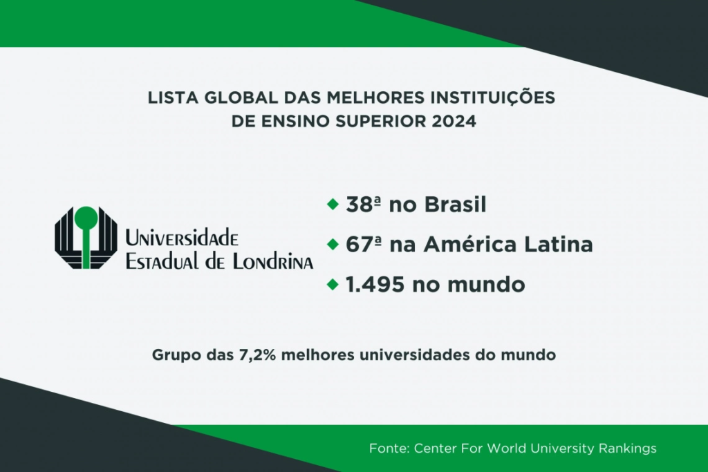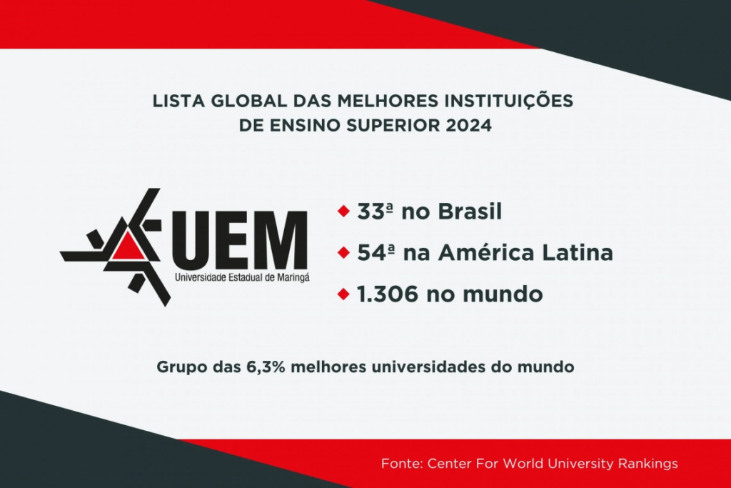 Ranking internacional — As universidades estaduais de Londrina (UEL) e Maringá (UEM) estão mais uma vez na lista global das 2.000 melhores instituições de ensino superior, segundo o Center for World University Rankings (CWUR). Na edição de 2024, a UEM subiu duas posições nas classificações nacional e global, e agora é considerada a 33ª universidade mais bem avaliada do Brasil. No ano passado a instituição ocupava a posição 35 nesse estrato. A UEM está classificada como 54ª da América Latina e 1.306ª do ranking geral. A UEL figura como a 38ª melhor do Brasil e 67ª melhor da América Latina. No global, a instituição aparece na posição 1.495.